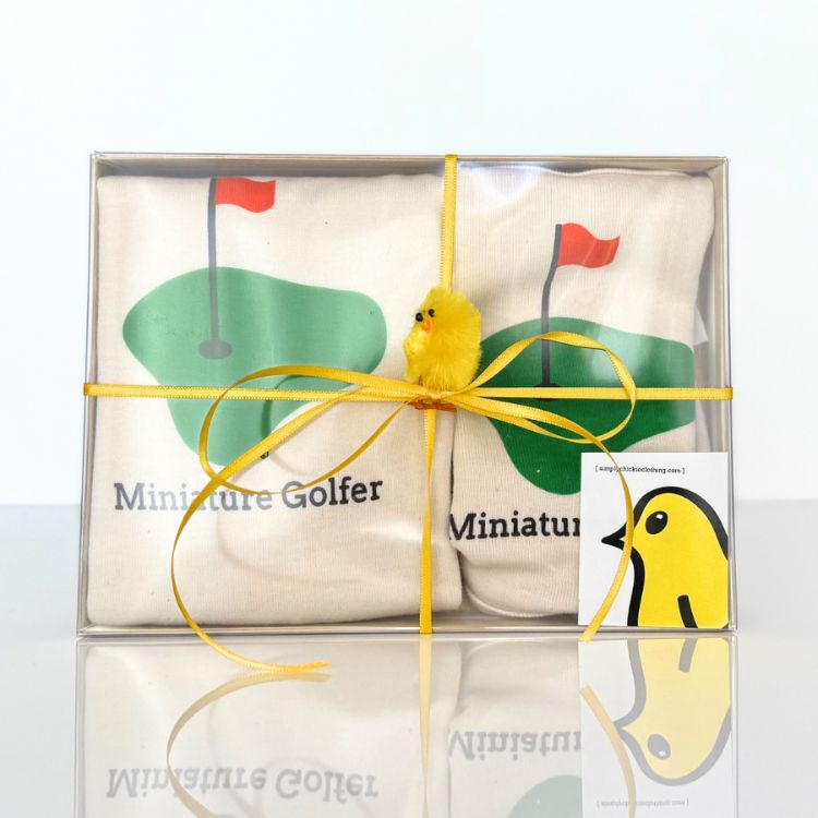 The Mini Golfer Long Sleeve Romper and Pant Set is perfect for newborns who love to sport a stylish look. The romper features an easy snap closure for quick and easy diaper changes. The pants have an elastic waist band. The graphic is on the right rear pocket area.